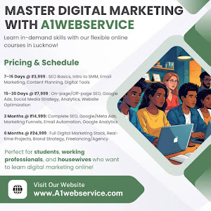 A1webservice is a trusted digital marketing training institute in Lucknow offering professional digital marketing training in Lucknow and SEO training in Lucknow for students, job seekers, and professionals. Recognized among the top digital marketing institutes in Lucknow, we provide practical, industry-focused learning. Our digital marketing course in Lucknow covers SEO, social media marketing, Google Ads, content marketing, analytics, and online branding. As a leading SEO training institute in Lucknow, we deliver hands-on SEO courses in Lucknow designed for real-world success. We offer digital marketing certification in Lucknow, advanced digital marketing courses in Lucknow, online digital marketing courses in Lucknow.